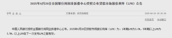 财经6月20日讯 今日,中国人民银行授权全国银行间同业拆借中心公布,2025年6月20日贷款市场报价利率(LPR为:1年期LPR为3.0%,5年期以上LPR为3.5%,均较前值持平。以上LPR在下一次发布LPR之前有效。