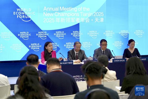 6月17日,世界经济论坛第十六届新领军者年会(又称“夏季达沃斯论坛”新闻发布会在北京举行。据介绍,本届夏季达沃斯论坛各项筹备工作已基本就绪,来自90多个国家和地区的约1800名嘉宾将于6月24日至26日在天津共同参会。新华社记者 辛梦晨 摄