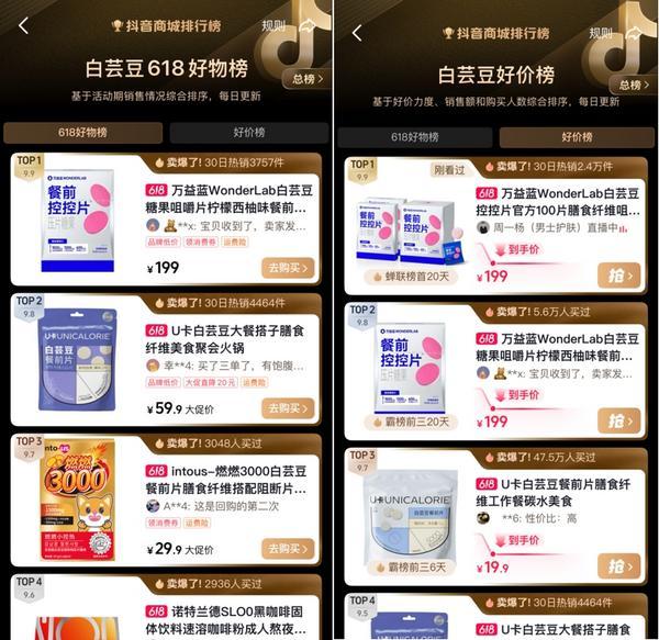 此外,万益蓝餐前控控片™凭借对白芸豆的深入持续研发,一经推出便广受消费者青睐。618 期间,“餐前控控片™” 销量继续稳步攀升,稳居同类产品领先位置并成功斩获抖音商城白芸豆618好物榜TOP1及白芸豆好价榜TOP1,为消费者提供了一种简单、便捷的控卡方式,让人们在享受美食的同时,也能轻松实现轻盈生活的目标。