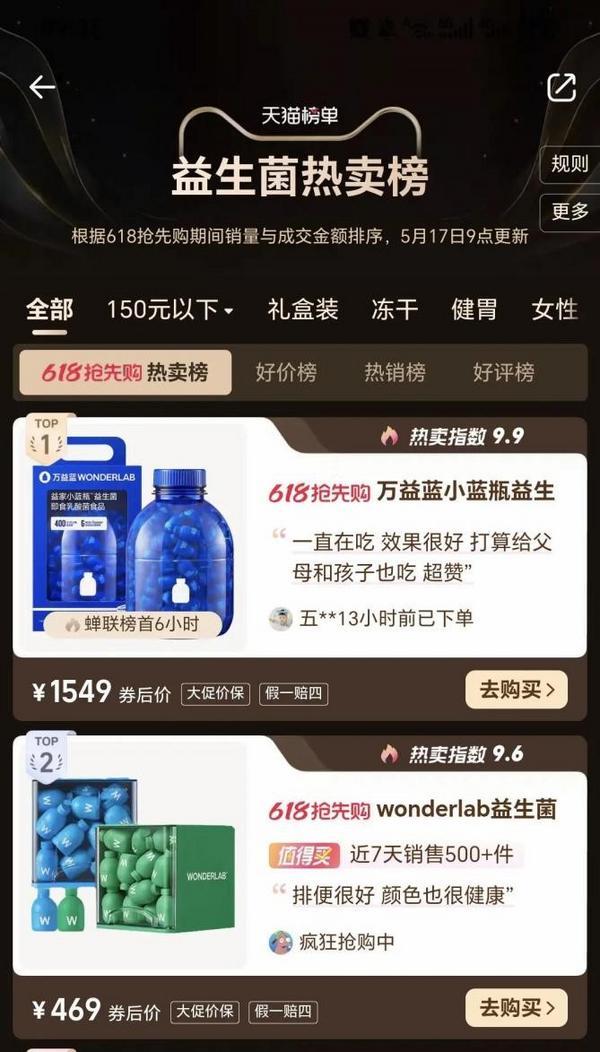 在益生菌核心赛道,万益蓝持续深耕创新。618期间,万益蓝小蓝瓶益生菌成功斩获天猫益生菌热卖榜TOP1,显示了其强大的市场影响力。今年5月上新的万益蓝WonderLab第4代成人广谱益生菌(俗称“小蓝瓶”在菌株研发、配方设计、技术应用等方面实现突破,为消费者带来更优质的健康管理新方案。焕新后的小蓝瓶采用万益蓝自主研发的鼠李糖乳酪杆菌 GOLDGUT - M520,在原有基础上加入三类9株优势菌群,通过菌群间的协同作用,实现菌种结构上的优化搭配,为消费者带来更优质的肠道健康管理方案。