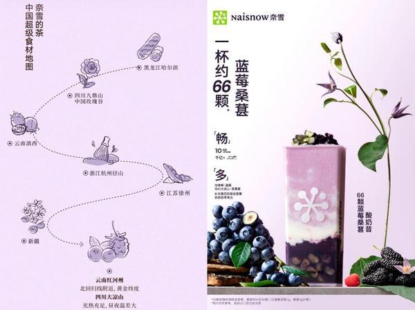奈雪使用的四川大凉山桑葚,生长于海拔 1500 - 2500 米雪域山区,年均 2000 小时日照,采用山泉水灌溉,其花青素含量达到葡萄的 10 倍以上,口感爆汁清甜,每颗果实富含维生素 E、钙等多重营养。而云南红河蓝莓同样品质上乘,颗颗新鲜大颗饱满,为消费者带来绝佳的口感体验。