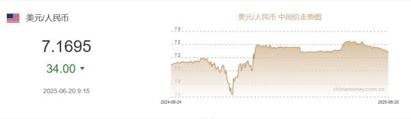 据中国外汇交易中心网站消息,中国人民银行授权中国外汇交易中心公布,2025年6月20日银行间外汇市场人民币汇率中间价为:1美元对人民币7.1695元,上调34个基点。