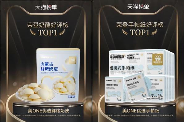 值得一提的是,618期间,美ONE优选的自营新品以硬核口碑印证这一策略:618前上线的40款新品中,内蒙古鲜烤奶皮荣登天猫奶酪好评榜TOP1,猪肉脯荣登天猫猪肉脯热销榜TOP2,手帕纸荣登天猫手帕纸好评榜TOP1;宠物地垫荣登地垫入户门垫热评榜TOP1。这些覆盖食品、日护、宠物赛道的爆款,正是美ONE精准洞察“品质悦己”消费趋势的缩影,成为连接消费者与理想生活的重要桥梁。