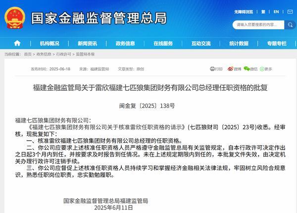 财经6月18日讯 今日,福建金融监管局公布相关批复,核准雷欣福建七匹狼集团财务有限公司(简称“七匹狼集团财务公司”总经理的任职资格。以下是相关批复正文:
