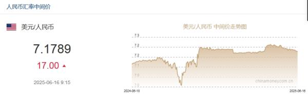 据中国外汇交易中心网站消息,中国人民银行授权中国外汇交易中心公布,2025年6月16日银行间外汇市场人民币汇率中间价为:1美元对人民币7.1789元,下调17个基点。