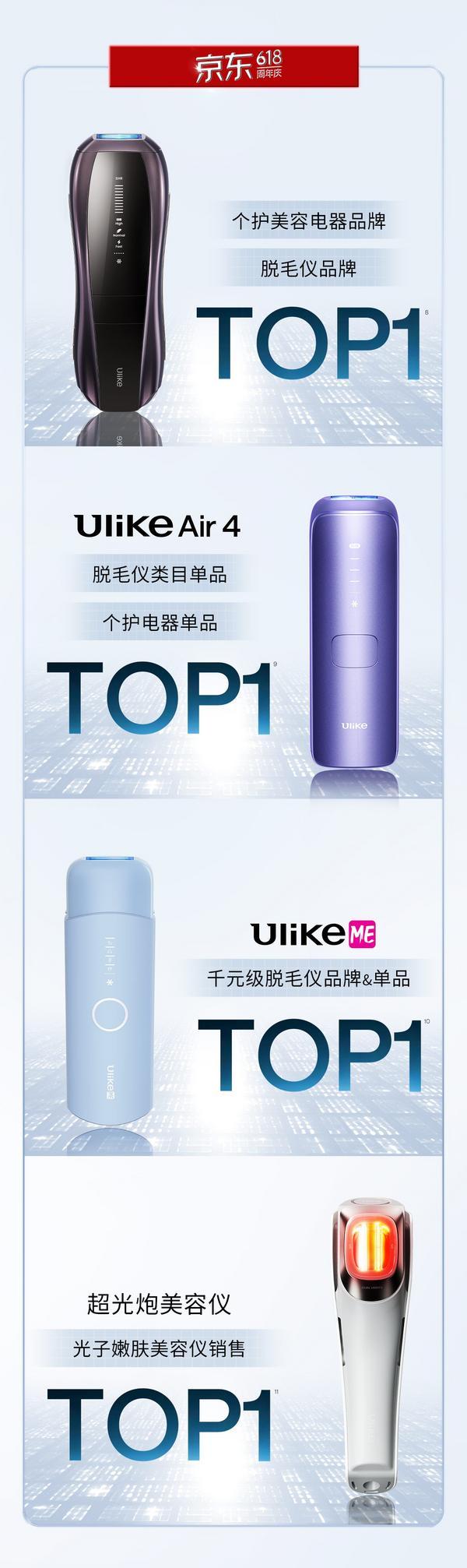 Ulike斩获京东平台“个护美容电器品牌”、“脱毛仪品牌”、“脱毛仪类目单品”、“个护电器单品”、“千元级脱毛仪品牌&单品”等多个榜单第一;Ulike超光炮美容仪获得“光子嫩肤美容仪”销售第一。