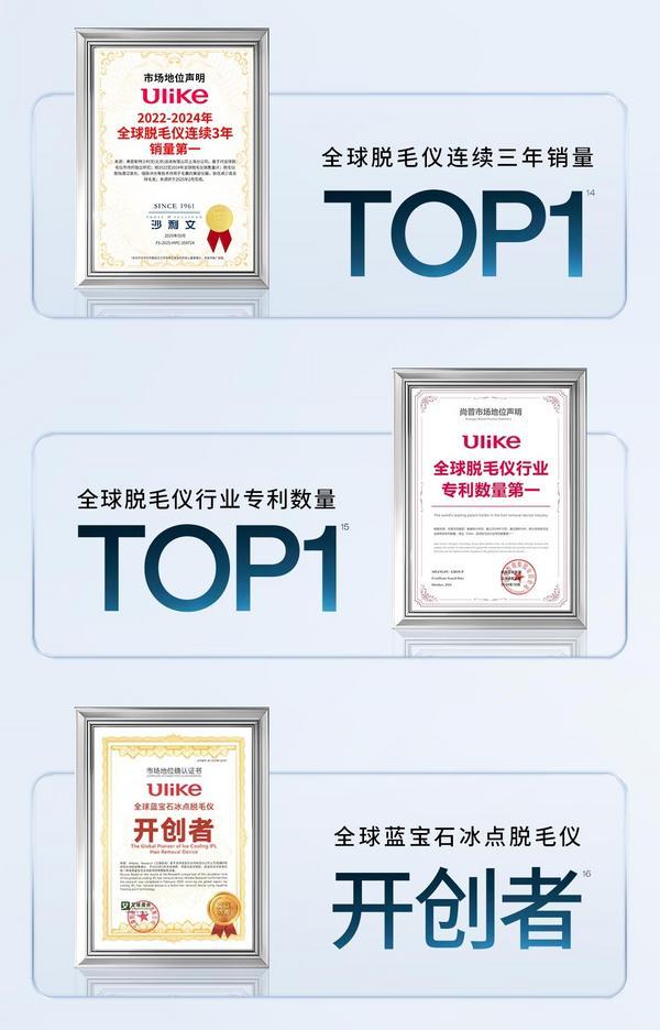 Ulike不仅在中国连续10年618销售行业第一,更是被认证为“全球销售第一的脱毛仪”。根据弗若斯特沙利文(Frost & Sullivan调研数据,在2016年-2024年度中国脱毛仪市场中,Ulike连续9年销售第一;并在2022年-2024年度全球脱毛仪市场中,Ulike连续3年销量第一。