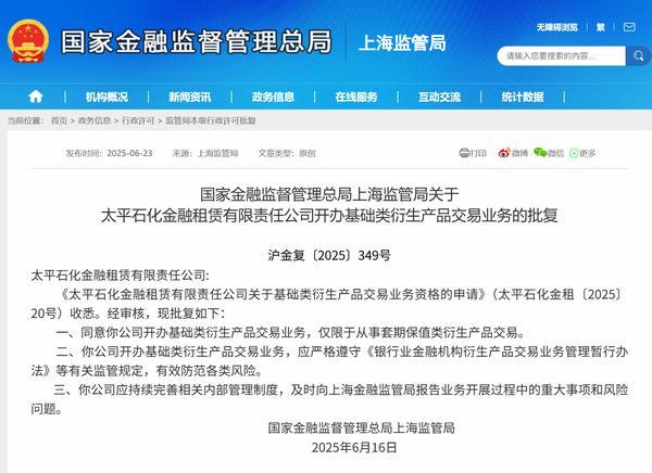 财经6月24日讯 昨日,国家金融监督管理总局上海监管局公布相关批复,同意太平石化金融租赁有限责任公司(简称“太平石化金租”开办基础类衍生产品交易业务,仅限于从事套期保值类衍生产品交易。以下是相关批复正文:
