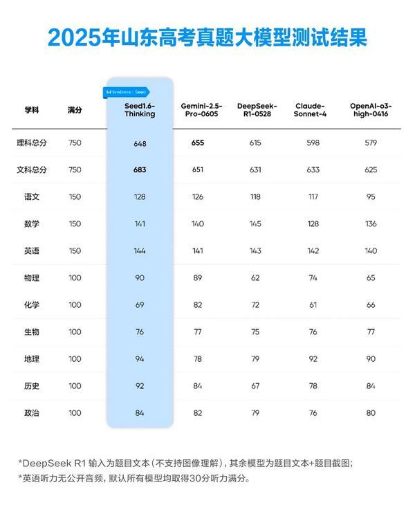 日前,字节跳动Seed团队公布2025高考全科测试结果。该测试采用全国新一卷和山东省自主命题,豆包Seed1.6-Thinking模型的文科和理科成绩分别达到683分和648分。在同期测试的国内外5款顶级模型中,豆包文科成绩获最高分,理科仅次于谷歌Gemini 2.5 Pro,后者成绩为655分。
