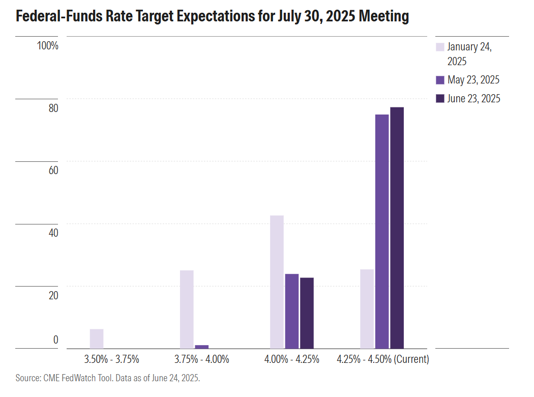 尽管过去几个月的通胀数据相对较低,但根据芝加哥商品交易所(CME)的“美联储观察”工具显示,期货市场认为美联储在7月会议上维持利率不变的几率为77%。