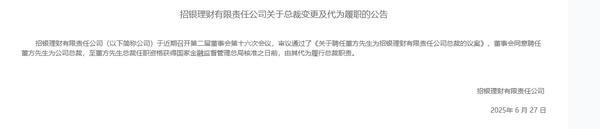 财经6月30日讯 日前,招银理财官网发布《招银理财有限责任公司关于总裁变更及代为履职的公告》显示,招银理财于近期召开第二届董事会第十六次会议,审议通过了《关于聘任董方先生为招银理财有限责任公司总裁的议案》,董事会同意聘任董方为公司总裁,至董方总裁任职资格获得国家金融监督管理总局核准之日前,由其代为履行总裁职责。