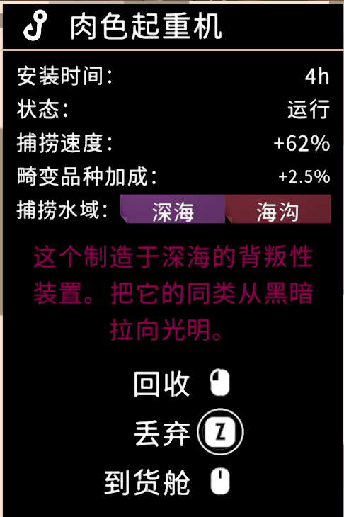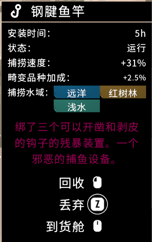 钓鱼的过程是完全自动化的,玩家就算什么键都不按鱼也会慢慢自动抓上来。当圈上的箭头转到色块时按下F键,左侧进度条中的鱼就会被往上拉。通过这个操作可以加快捕鱼的速率。