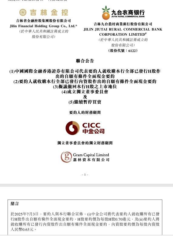财经7月4日讯 7月3日,九台农商银行发布公告称,中金公司将代表要约人(吉林省金融控股集团股份有限公司,下称“吉林金控”就收购所有已发行H股作出自愿有条件全面现金要约,H股要约价为每股H股0.70港元,吉林金控将就收购所有已发行内资股作出自愿有条件全面现金要约,内资股要约价为每股内资股人民币0.63元。