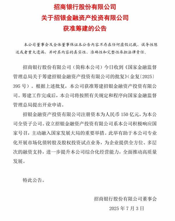 财经7月4日讯 7月3日,招商银行发布公告称,该行收到《国家金融监督管理总局关于筹建招银金融资产投资有限公司的批复》(金复〔2025〕395号。根据上述批复,招商银行获准筹建招银金融资产投资有限公司。筹建工作完成后,招商银行将按照有关规定和程序向国家金融监督管理总局提出开业申请。