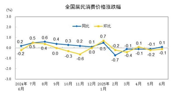 7月9日,国家统计局公布6月物价数据。6月份,全国居民消费价格(CPI同比上涨0.1%,环比下降0.1%。上半年,全国居民消费价格比上年同期下降0.1%。