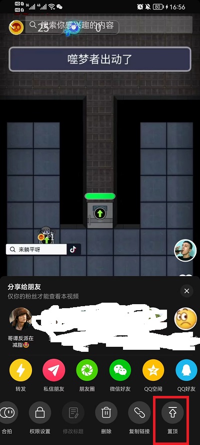 3、在弹出的功能选项中,左滑下方的功能,就可以在最右边的【置顶】进行视频的置顶操作。