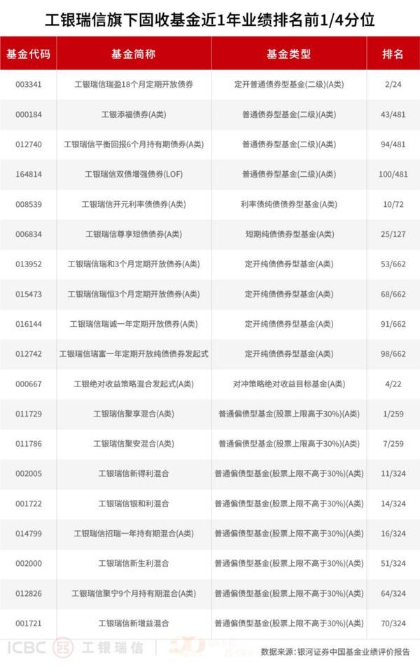在纯债投资提供安全边际的基础上,工银瑞信积极拓展“固收 ”领域,努力在控制波动和回撤的前提下获取增强收益。银河证券业绩数据生动地印证了其在“固收 ”不同细分策略上的突出表现。在追求收益弹性的二级债基、可转债基金及偏债混合型基金阵营中,不乏表现抢眼的冒尖产品。银河证券数据显示,近一年,工银聚享混合A名列同类第一(1/259,工银瑞盈18个月定期开放债券名列同类第二(2/24,工银银和利混合、工银新得利两只偏债混合型基金业绩表现均名列同类产品前1/10(14/324、11/324。