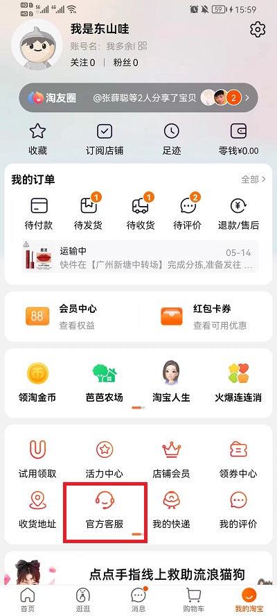 2、在我的淘宝界面,下方会有一个【官方客服】的功能,打开此功能;