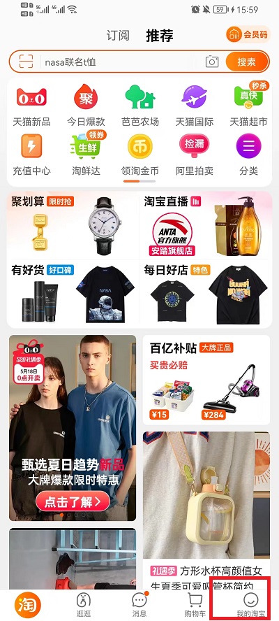 1、打开淘宝,在淘宝的首页界面中点击下方的【我的淘宝】进入到该界面中;