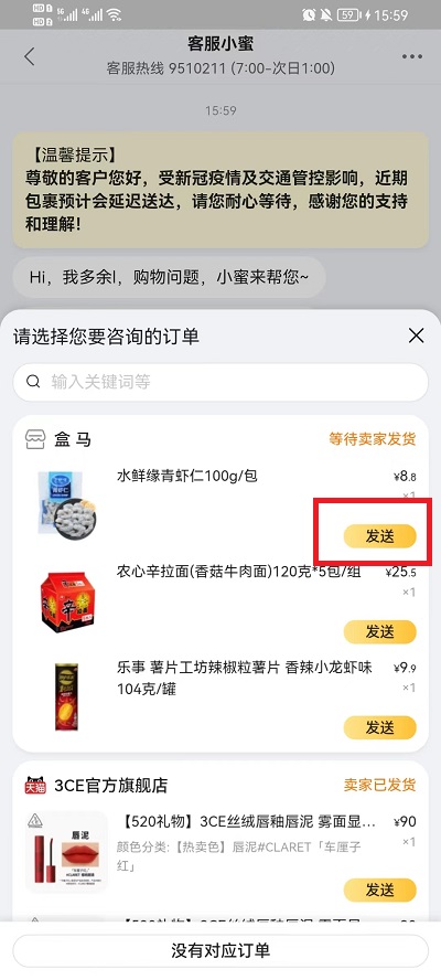 4、在投诉界面中,点击想要投诉的商品,点击其中的【发送】就可以发送给小蜜进行投诉。