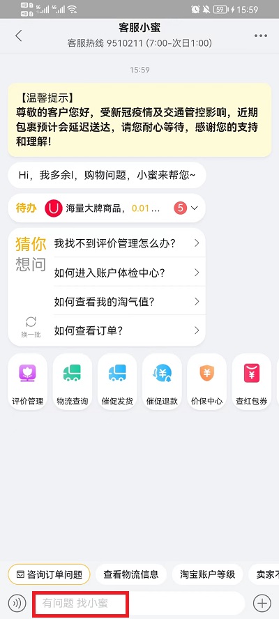 3、在此功能中,下方的输入框中输入【投诉】发送给小蜜,就可以进行投诉;