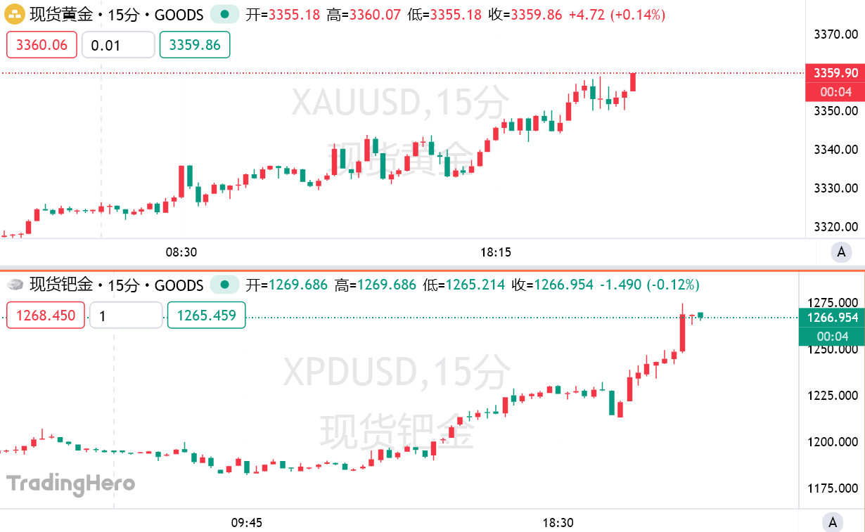 周五,由于市场对特朗普最新关税声明的担忧情绪升温,促使投资者转向避险资产,现货黄金日内涨超1%,突破3360美元关口。现货钯金日内大涨6%,现报1272美元/盎司左右,创2023年10月以来新高。