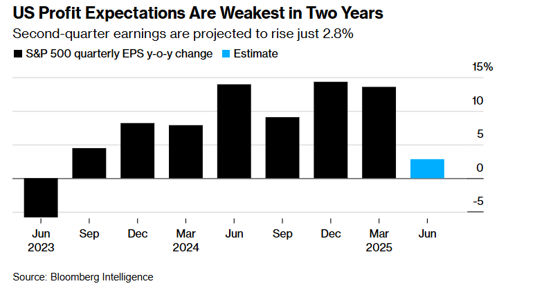 事实上,市场预期并不高:华尔街正准备迎接2023年中期以来最疲软的财报季。彭博情报数据显示,分析师预计标普500指数成分股二季度利润同比增长2.5%;11个板块中,有6个预计出现利润下滑;同时,该指数全年增长预期已从4月初的9.4%降至7.1%。