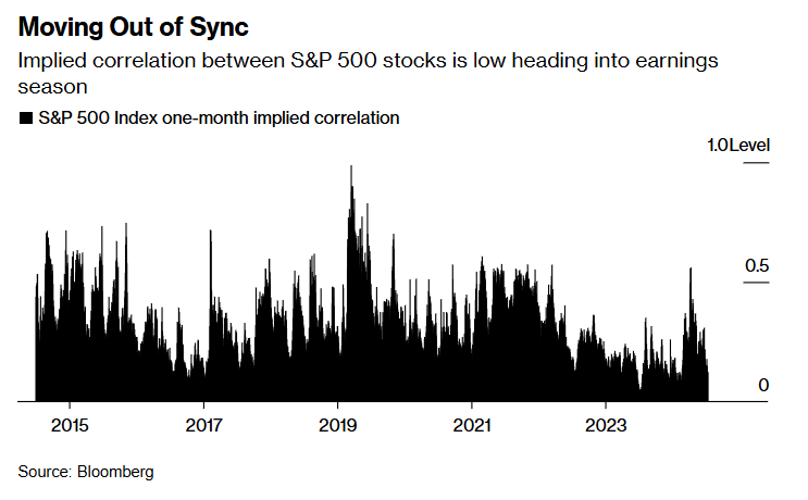 美股个股走势分化程度达到近年罕见水平。彭博数据显示,标普500指数成分股未来一个月的预期相关性指数为0.12(数值为1表示完全同步)。过去10年中,该指数低于这一水平的时间仅占3.2%。