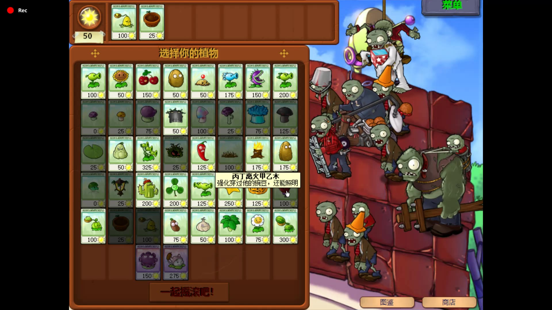 五种植物的选择适当就好,建议选择豌豆射手、向日葵、坚果、倭瓜和樱桃炸弹。豌豆射手类是主攻手,向日葵用于提供能量,坚果提供防御,倭瓜则具备近身攻击力于一身,樱桃炸弹作为清场工具,可以用来对付大批僵尸。