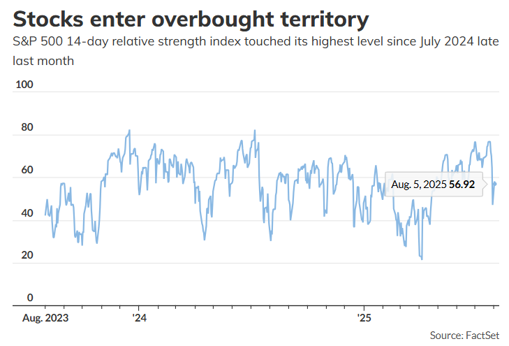 标普500指数的14天相对强弱指数(RSI)在七月28日突破了76,这是自去年七月以来的最高读数。此后不久,抛售便开始了,该指数滑向了回调的边缘。