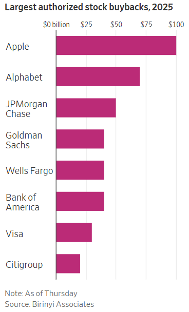 回购规模最大的公司包括科技巨头苹果和谷歌母公司Alphabet。大型银行如摩根大通、美国银行和摩根士丹利也在这波回购潮中占据主导地位。