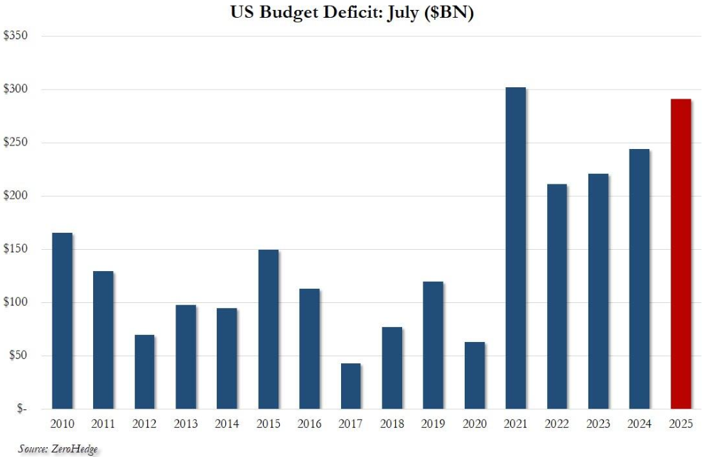 将收支两项合并计算,7月财政赤字达到2910亿美元,较6月270亿美元盈余出现戏剧性恶化,同比去年7月的2430亿美元赤字扩大20%,成为2025自然年第二大月度赤字。更糟的是,这也是美国历史上第二高的7月赤字纪录,仅略低于新冠疫情后开支激增的特殊时期。