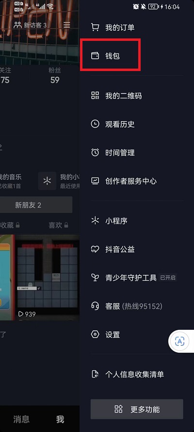 2、在弹出的界面中,点击其中的【钱包】进入到钱包界面;