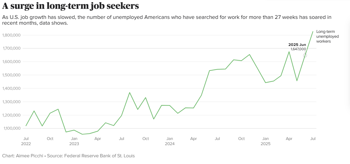 另一个令人担忧的迹象是长期求职者数量近期激增,即那些寻找工作超过27周的人。7月份,约有180万美国人寻找工作超过27周,比三年前增加了约64%,比一年前增加了20%。