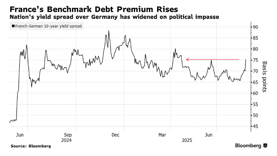 法国政府面临再度垮台的风险,该国总理弗朗索瓦·贝鲁(Francois Bayrou)已要求举行信任投票,结果可能最早于下月让政府倒台。此举引发法国资产连续第二天下跌,投资者正为更多政治不确定性进行对冲。