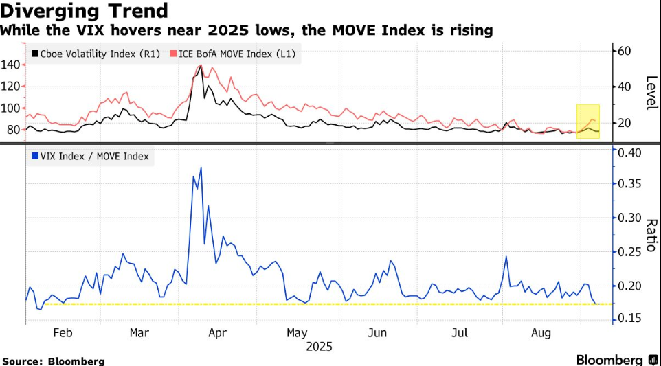 衡量标普500预期价格波动的VIX指数徘徊在年内最低点附近;反之,债券市场的“恐慌指数”——ICE美银MOVE指数在上周二和周三累计上涨10点,创下自4月关税动荡高峰以来最大两日涨幅,预示债市已为波动率回升做好准备。