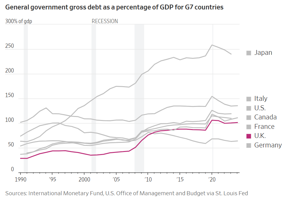 如今,投资者要求英国为借贷支付“小幅溢价”——英国借贷成本近年大幅上升,部分原因是通胀持续高企。过去一周,英国30年期国债收益率攀升至1990年代末以来的最高水平,超过债务规模更大的法国;英国10年期国债收益率目前为G7国家中最高,超过美国。