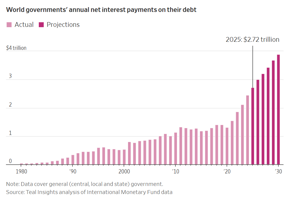 过去一年,全球各国政府债务的净利息支出增长11.2%,达2.72万亿美元,部分源于高通胀持续推高利率。