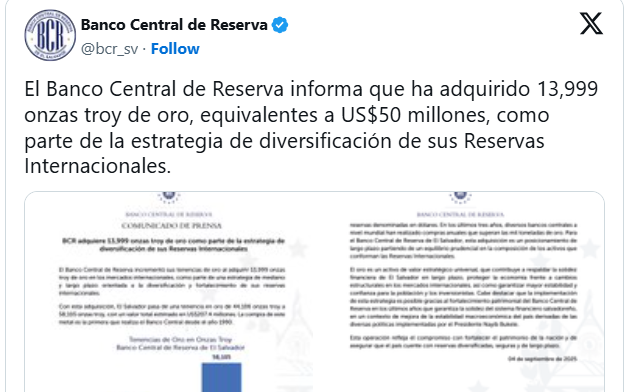 在布克尔政府治下,萨尔瓦多央行资产规模显著扩大,宏观经济稳定性同步提升,为此次黄金交易提供了条件。黄金作为全球性战略资产,有助于确保该国储备的多元化与长期安全性。