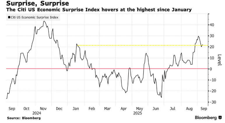 这也解释了为何芝加哥期权交易所波动率指数(VIX)远低于20这一“交易员开始担忧”的关键关口。与此同时,花旗美国经济惊喜指数——用于衡量经济指标实际值是否高于或低于预期的滚动指数——正处于今年1月以来的最高水平附近。