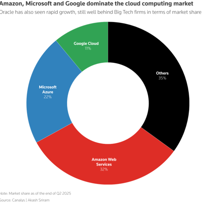 目前,微软(MSFT.O)、亚马逊云服务(AMZN.O)和谷歌云(GOOGL.O)以合计65%的份额主导云计算市场,而甲骨文、阿里巴巴、CoreWeave等公司占据较小市场份额。