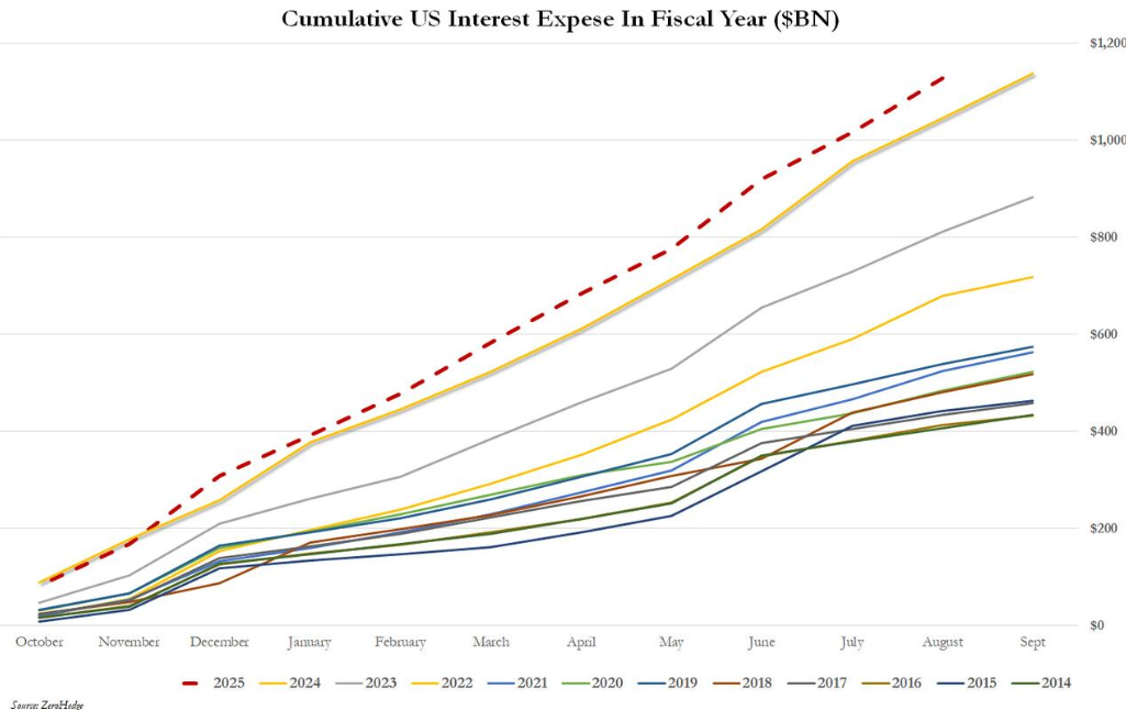 同样重要的是,美国惊人的利息支出灾难仍在持续攀升。8月份,美国支付了1115亿美元利息,使本财年前11个月的利息支出总额达到创纪录的1.124万亿美元,全年利息支出有望突破1.2万亿美元大关。