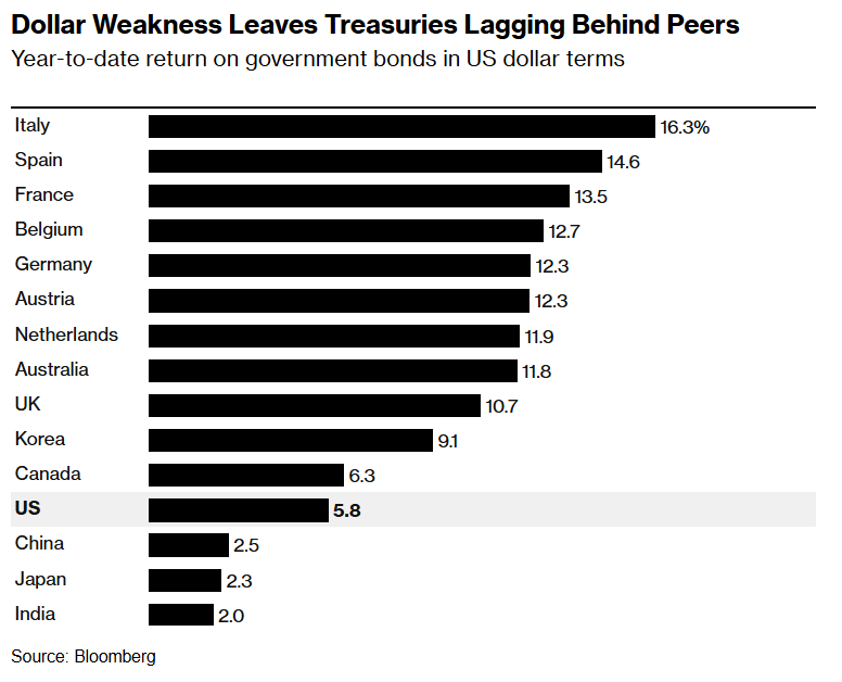 尽管以本币计价来看,美国国债今年击败了所有对手,但若计入汇率波动,情况则大不相同。