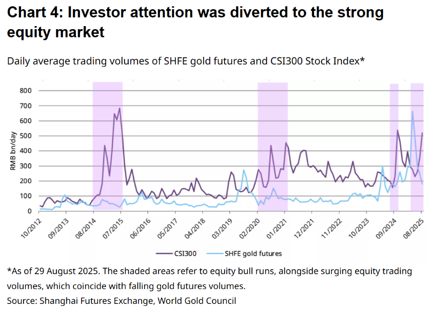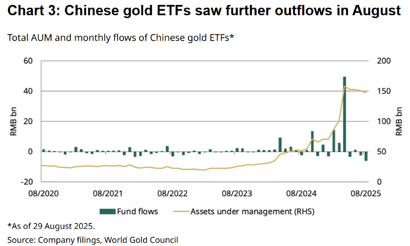 “与前述抑制金条销售的因素类似,股市强劲表现——沪深300指数8月飙升10%,创2024年9月以来最强月度涨幅——以及8月大部分时间金价的区间波动,也压制了黄金ETF需求,”他补充道。