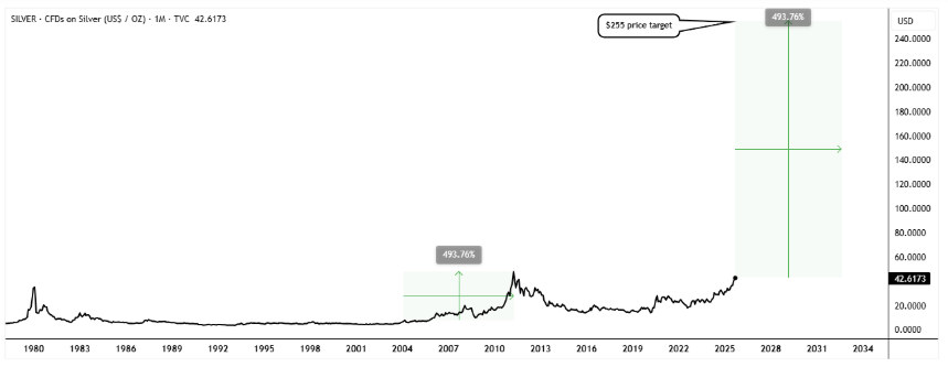 若历史重演,白银复刻2004-2011年表现,可能意味着其价格正处于多年上涨趋势的起点。基于结构对称性与比率预测,目标价或达255美元。这如今听似天方夜谭,但当初白银在8美元时,48美元的目标也曾被质疑。