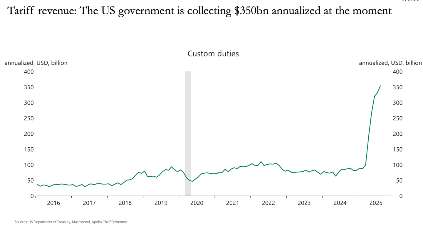 根据阿波罗全球资产管理公司的首席经济学家托斯滕·斯洛克(Torsten Slok)的说法,美国政府目前征收的关税收入,按年化计算约达3500亿美元,这是一个“非常可观”的数字。