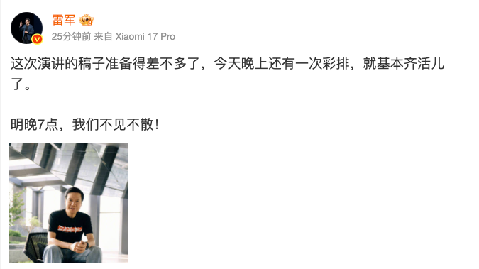 9月25日晚7点,雷军将带来他的第六次年度个人演讲,主题是《改变》。这次演讲不只是讲故事,还将捆绑小米最重磅的新品发布:小米17、小米17 Pro和小米17 Pro Max将正式登场。雷军发微博称,讲稿已经准备得差不多,晚上还会进行最后一次彩排。