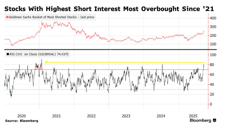 目前,高盛“最被做空股票篮子”的14日相对强弱指数(RSI)已升至2021年初“迷因股狂热”高峰以来的最高超买水平——当时散户交易者曾推动股票出现莫名的剧烈波动。通常而言,此类超买水平意味着回调即将来临。
