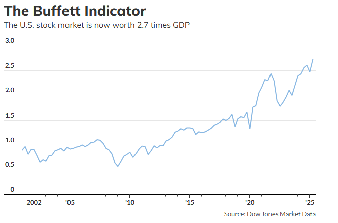 一些分析师喜欢将美国股市的总价值与美国经济的总产出进行比较,这后来被称为“巴菲特指标”。在2001年接受《财富》杂志采访时,伯克希尔哈撒韦公司主席巴菲特表示,将所有美国股票的市值与国内生产总值(GDP)进行比较,“可能是衡量任何特定时刻估值水平的最佳单一指标。”