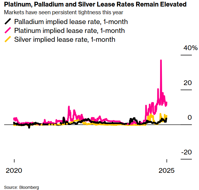 与此同时,其他贵金属今年遭遇空前供应紧张。随着数年供应短缺问题集中爆发,伦敦市场可自由流通金属库存不断萎缩引发担忧。白银、铂金和钯金的租赁利率(反映通常为短期的金属借贷成本)均已飙远高于近零的正常水平。